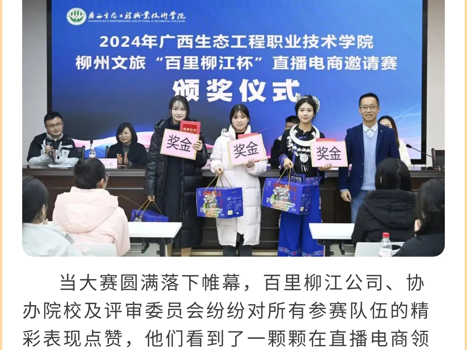高校聯(lián)合競(jìng)賽,共筑電商夢(mèng)想?——2024年廣西生態(tài)工程職業(yè)技術(shù)學(xué)院柳州文旅“百里柳江杯”直播電商邀請(qǐng)賽圓滿落幕 發(fā)布時(shí)間:2025年01月02日 18時(shí)來(lái)源:本站原創(chuàng)瀏覽:240 人次