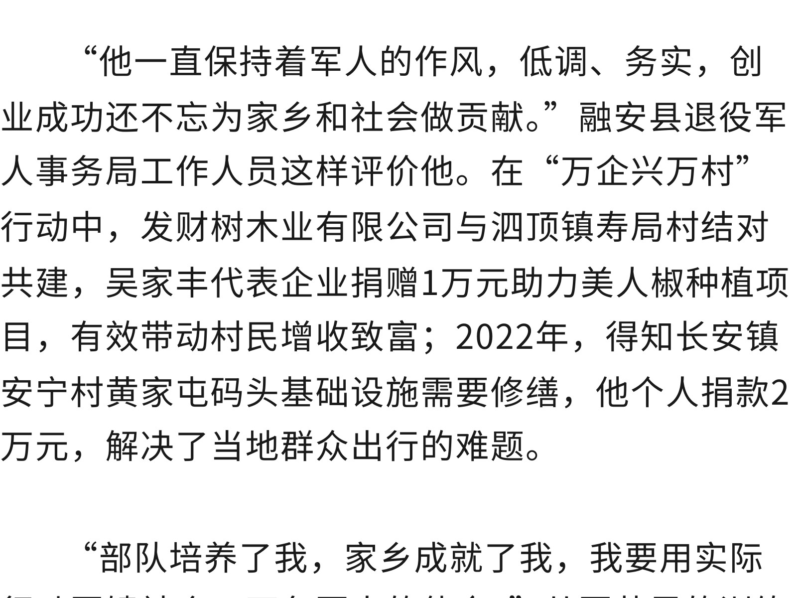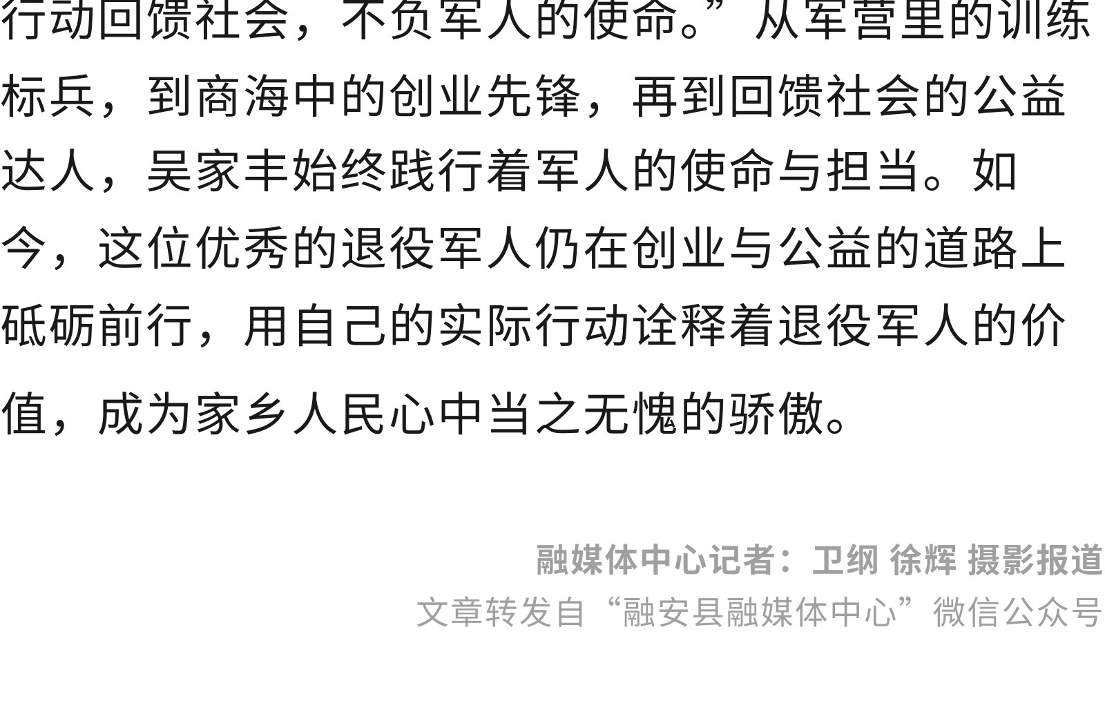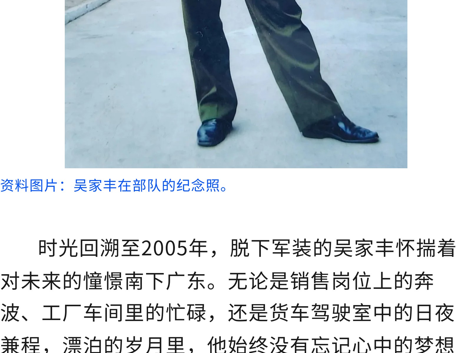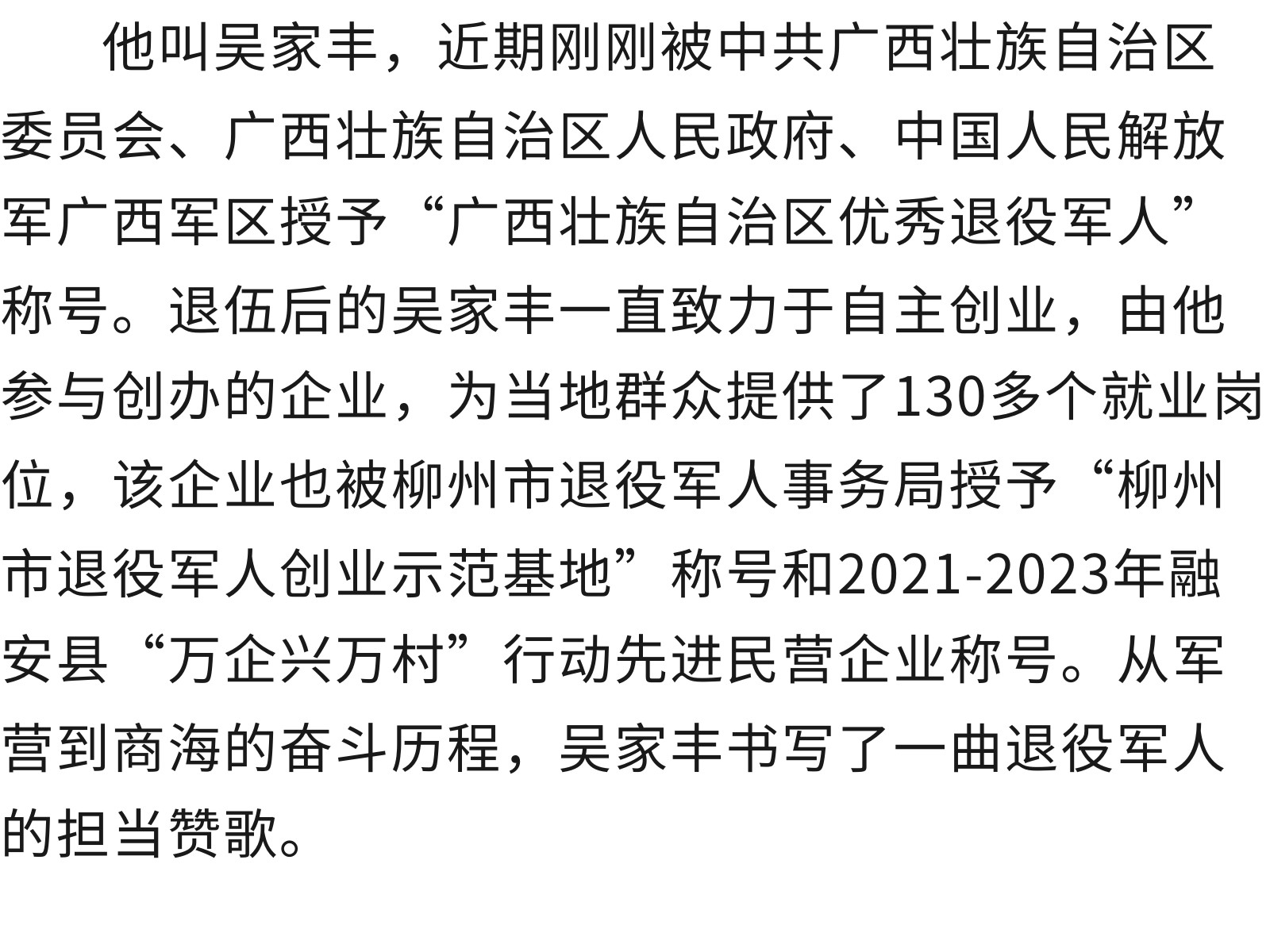 【最美退役軍人】從軍營硬漢到創(chuàng)業(yè)先鋒——記廣西優(yōu)秀退役軍人吳家豐 發(fā)布時(shí)間:2025年09月19日 09時(shí)來源:本站原創(chuàng)瀏覽:27 人次