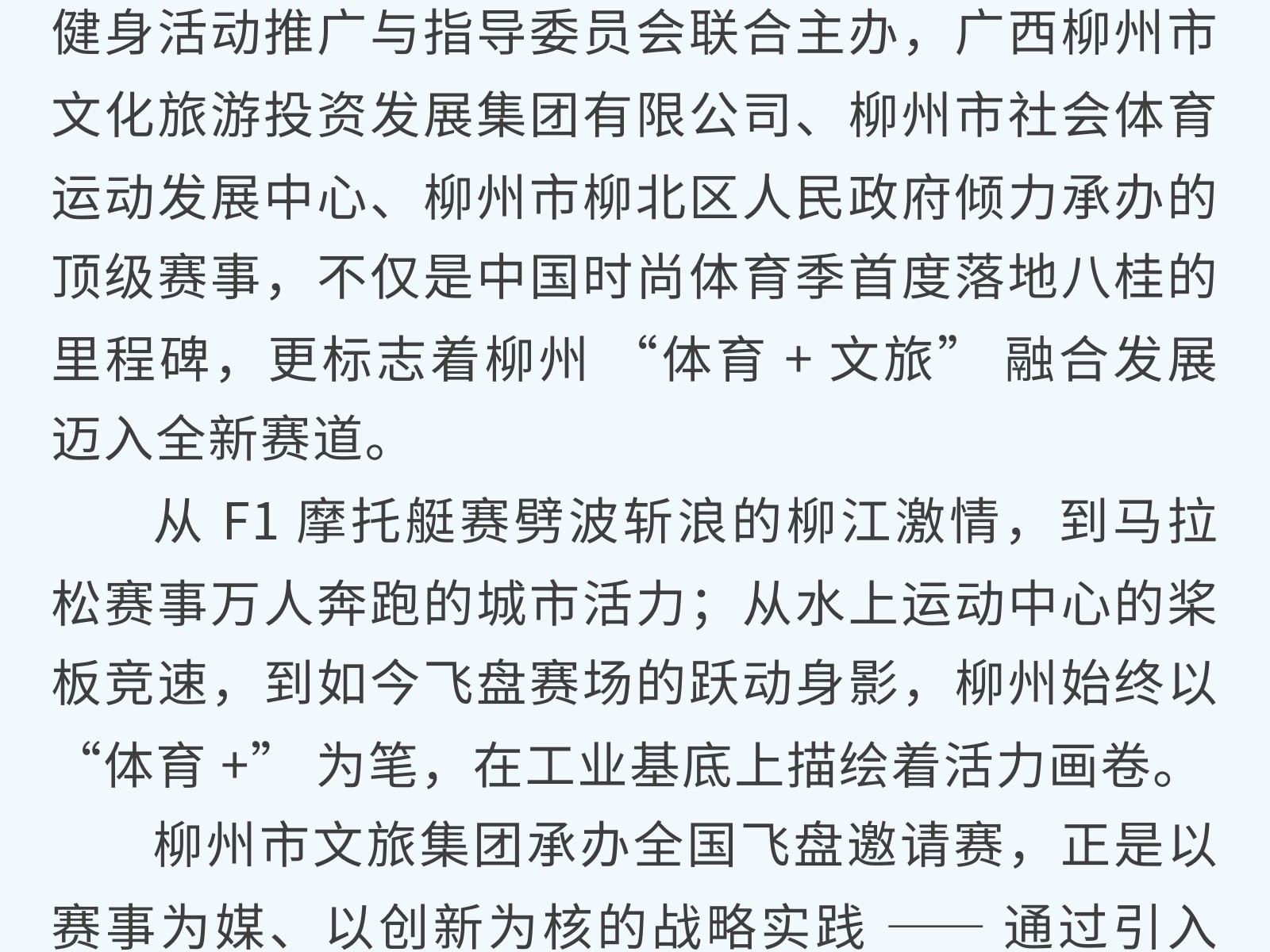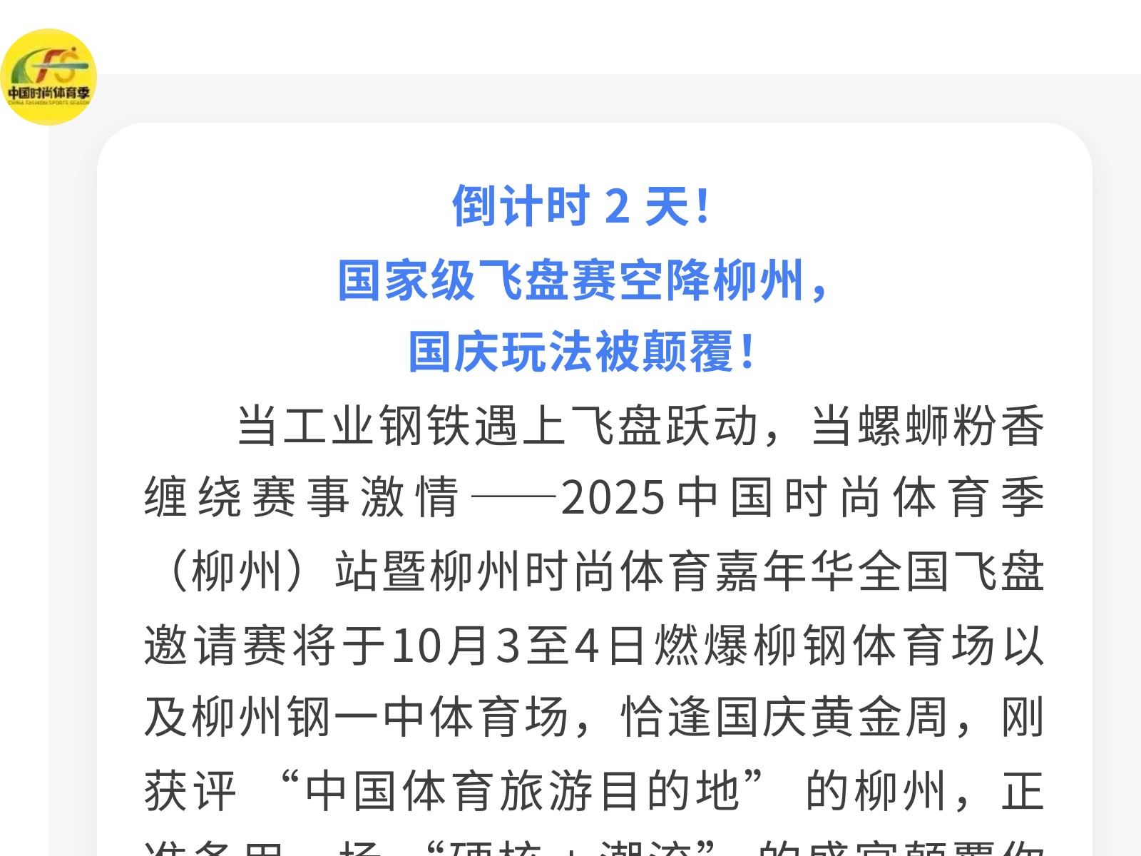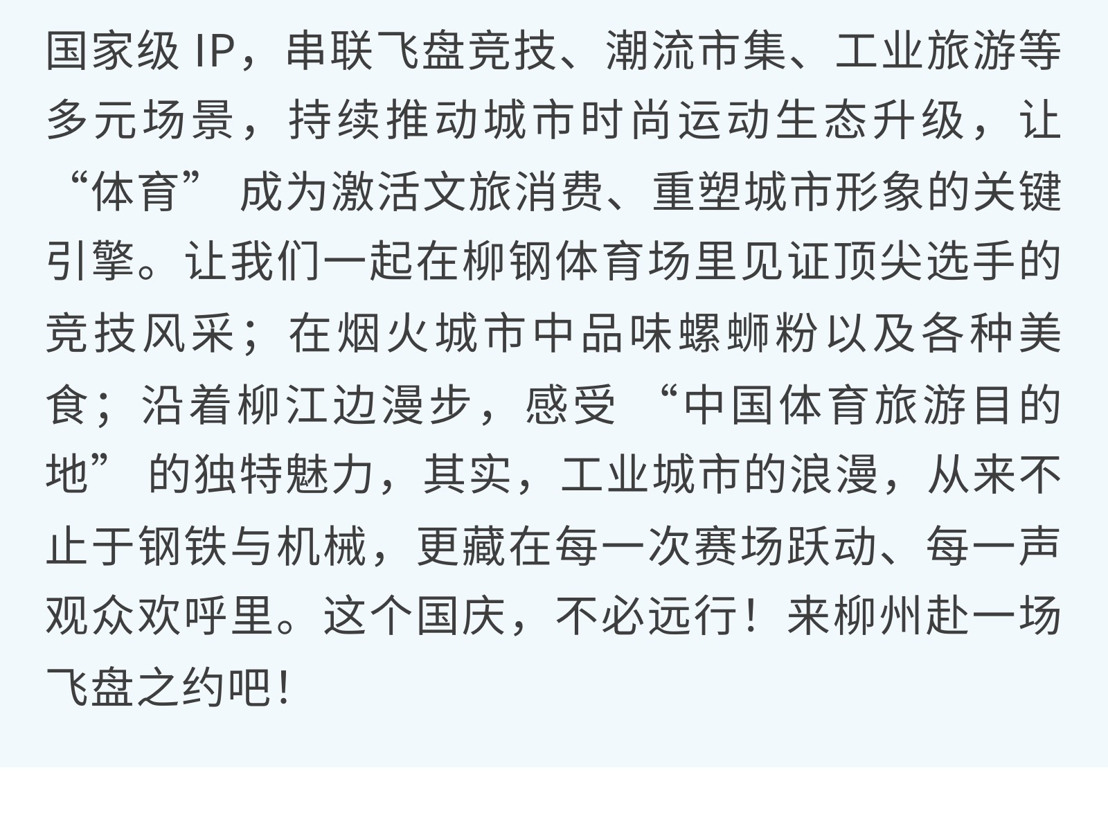 國慶赴柳!鋼鐵賽場飛盤燃,柳州這座體育旅游之城藏不住了 發(fā)布時間:2025年10月02日 17時來源:本站原創(chuàng)瀏覽:21 人次