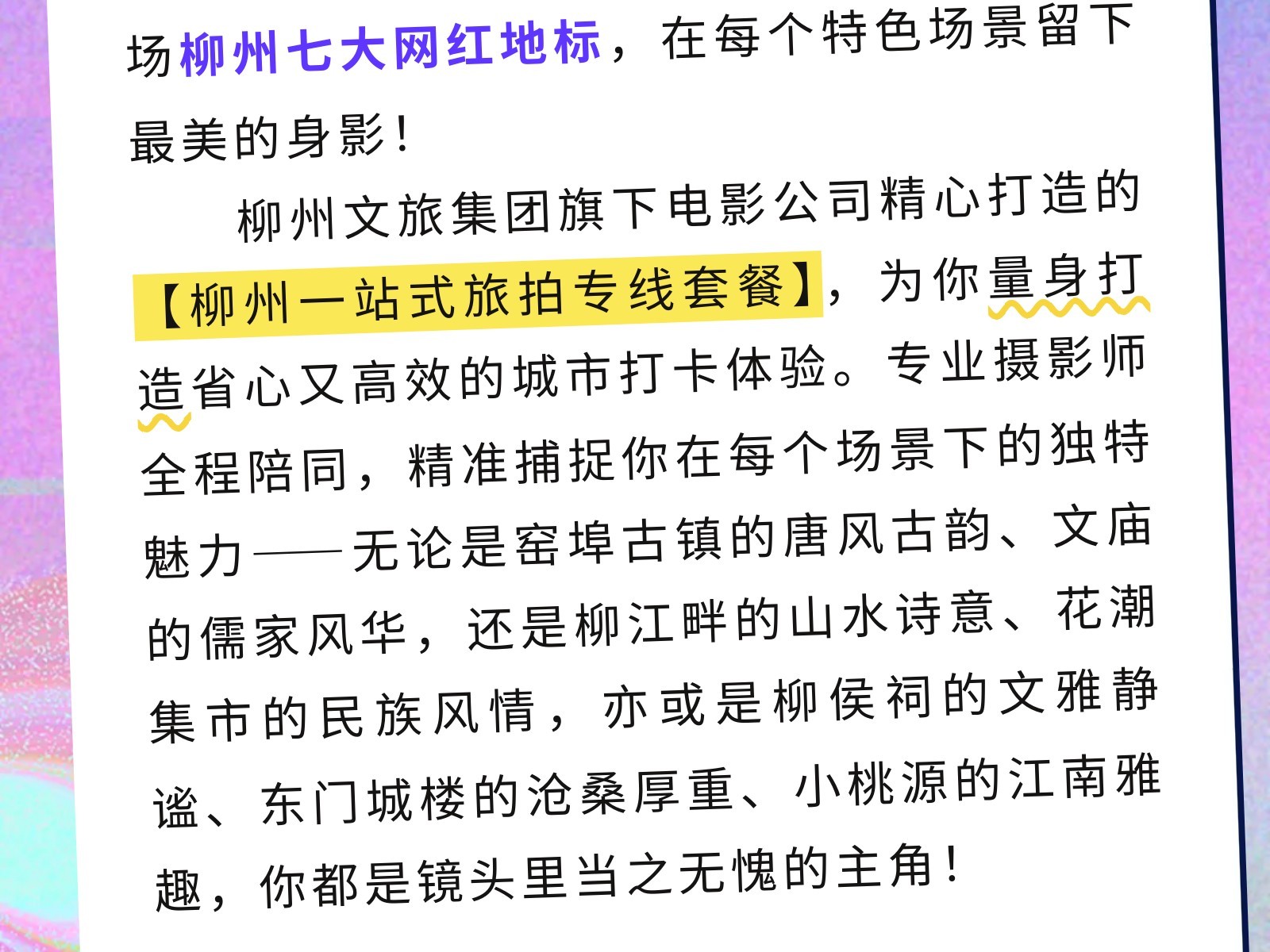 文旅集團電影公司創(chuàng)新打造獨家旅拍專線!穿越柳州絕美打卡點,定制你的專屬城市旅行大片! 發(fā)布時間:2025年11月05日 10時來源:本站原創(chuàng)瀏覽:13 人次