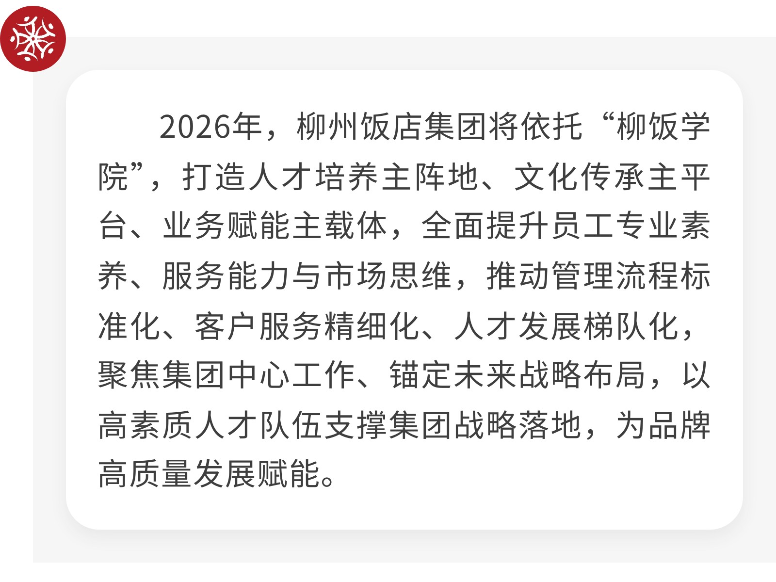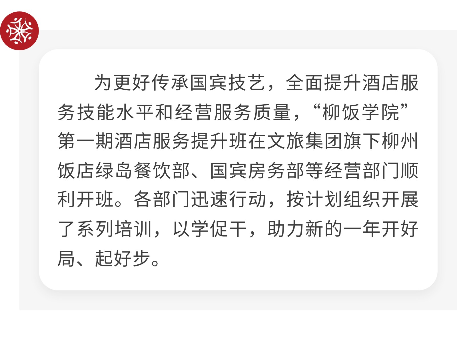 “柳飯學(xué)院”重磅啟班——首期酒店服務(wù)提升班開(kāi)課 以學(xué)促干鑄服務(wù)標(biāo)桿 發(fā)布時(shí)間:2026年02月13日 13時(shí)來(lái)源:本站原創(chuàng)瀏覽:40 人次